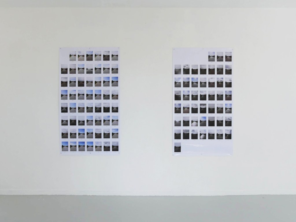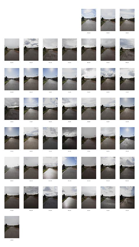 Le temps s’arrête, une nouvelle vie commence. Il est 12 heures, l’heure du premier cliché. Même heure, même lieu, même cadrage, une répétition jusqu’à l’étouffement. Ces images font silence. Muettes, elles ne disent rien. Lire ce silence, s’y engouffrer, y donner sens pour y entendre enfin la parole cachée. Récurrence d’un paysage mutique qui ne témoigne en rien. Il est là, il s’étend devant nos yeux. Toujours le même, et pourtant une variation infime le transforme. Il vacille, du même il devient autre.