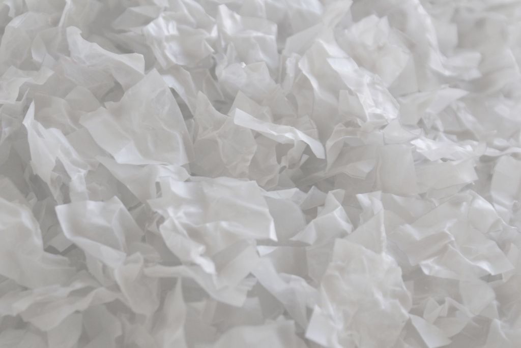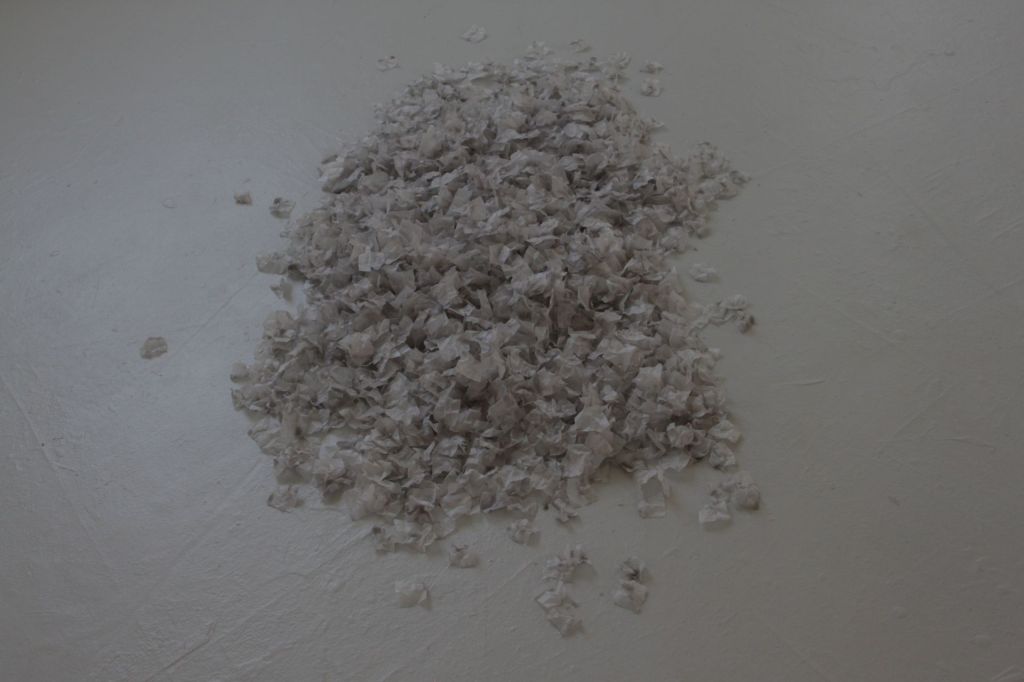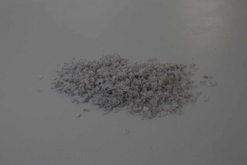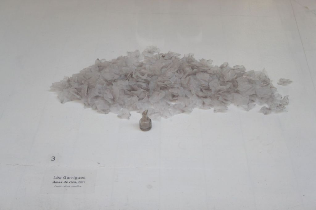 Amas de rien, installation composée de 1500 feuilles de papier calque de 4 cm de côtés recouvertes de paraffine, dimensions variables, juin 2019