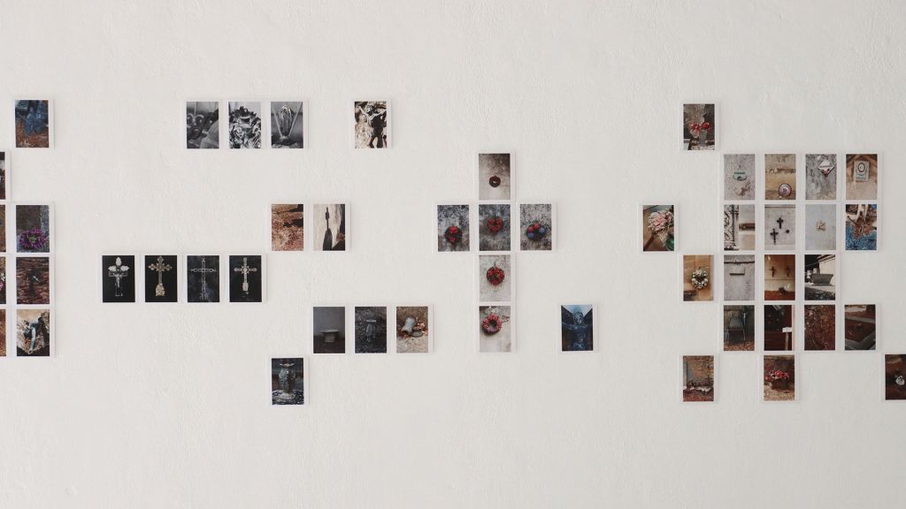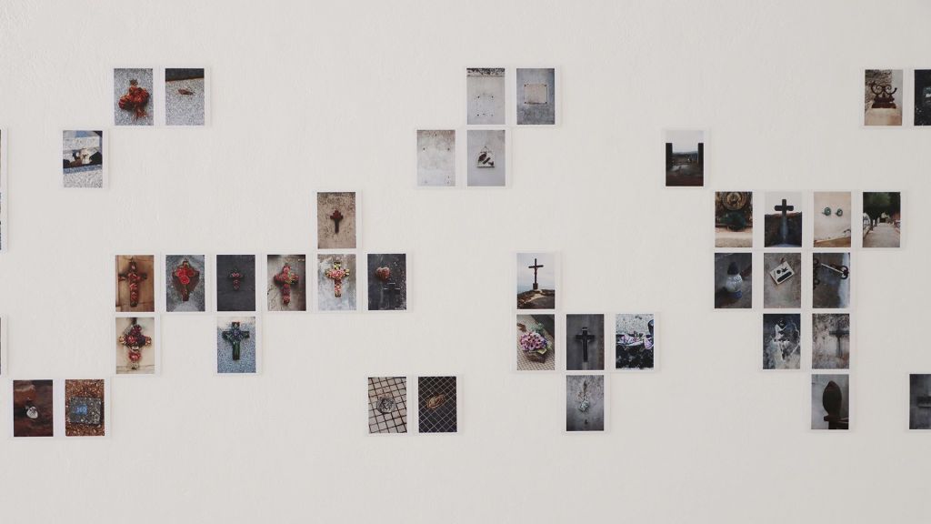 À travers cette installation photographique, je présente une collection, s’apparentant à une archive des objets commémoratifs funéraires. Cet ensemble s’étoffe au fil des visites de cimetières, pouvant être complété à l’infini.