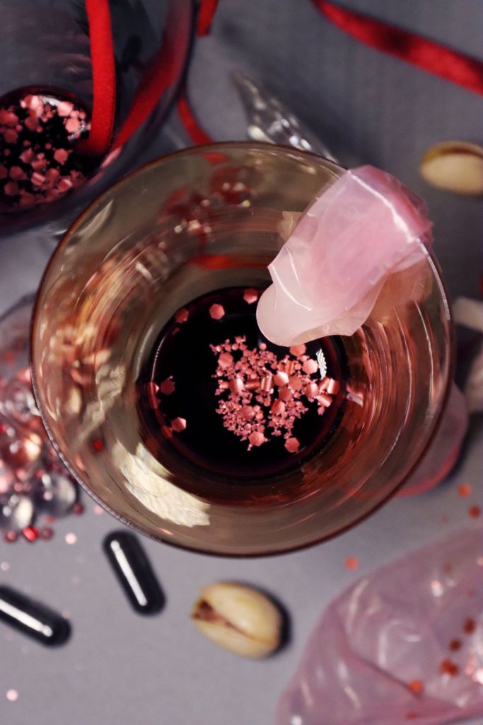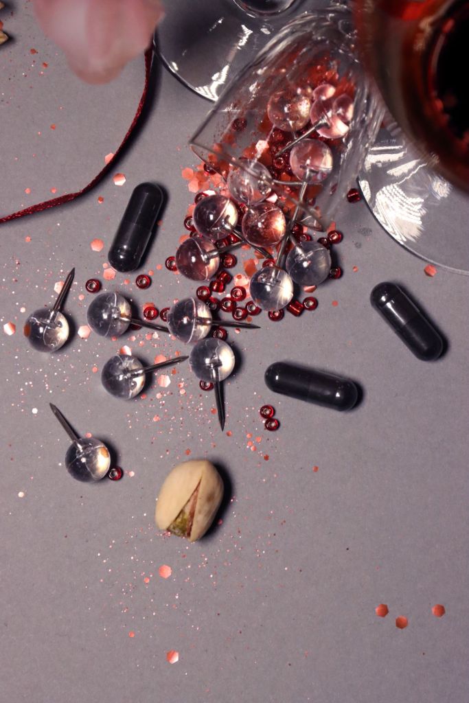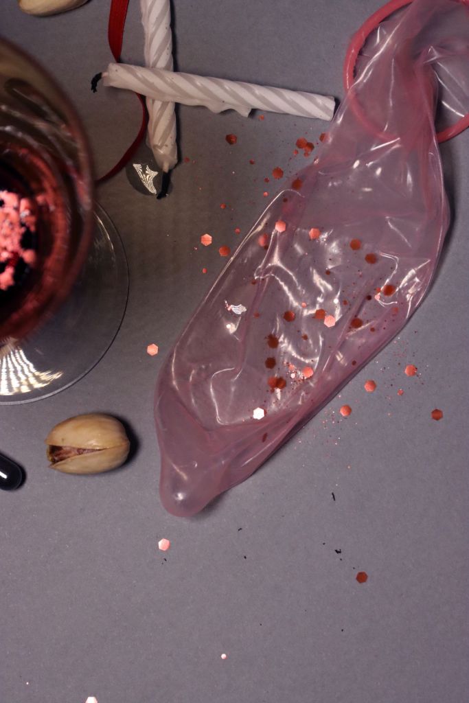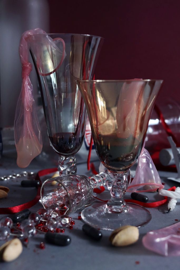 Entre « petite mort » et mort littérale, De sang et de sperme est une série photographique qui revisite la vanité de manière contemporaine en questionnant plaisir et mortalité. La vanité, catégorie de nature morte, représente la fragilité de la vie humaine au travers d’allégories. Ici, dans une composition aux airs de fin de soirée, le sang et le sperme, à la fois nécessaires à la vie et potentiels dangers, s’exposent en révélant leur caractère précieux. Le préservatif, à la fois réceptacle à liquide et barrière de protection, occupe une place centrale dans la composition, exposant ainsi le liquide blanc qu’il contient. Le sang, lui se fait plus discret. Fluide nécessaire à la vie, aussi bien présent dans les coupes que figuré par les paillettes ou les perles, est aussi synonyme de risque mortel. Il peut être vecteur de virus, tout comme le sperme, mais lorsque le liquide rouge se repend en masse il est évocateur de mort. Les paillettes rouges sont semblables à des projections de sang, transformant ainsi la nature morte en scène de crime allégorique. Des éléments plus traditionnels du genre de la vanité, tel que les bougies, sont également présents dans la composition, rappelant ainsi le caractère fragile de la vie humaine. Entre luxure, plaisir, insouciance, risques et sacralisation, véritable memento mori, cette série photographique exprime les plaisirs de la sexualité aussi bien que les potentiels risques encourus.